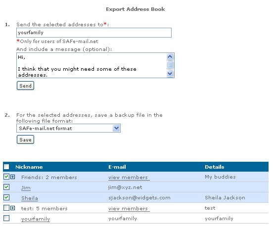 When another Safe-mail user sends address book entries to another user, those entries will arrive as an email message. You will then be able to import the address book entries from within your address book, or from within the email message in your inbox.