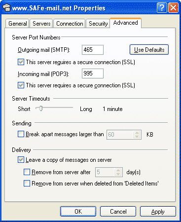 You need to determine whether you will allow Outlook to delete messages from the Safe-mail server. If you will be accessing your email from more than one computer, we recommend that you leave the messages on the server. For more information on how to leave messages on the server using POP3, read the instructions here.